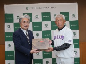 林社長から今年で退職される鈴木監督に贈呈しました。社員に野球部OBが所属する